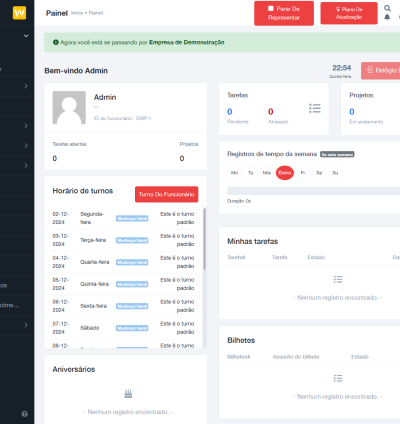 - Vários relatórios de tarefas, registros de tempo, finanças, presença e licenças