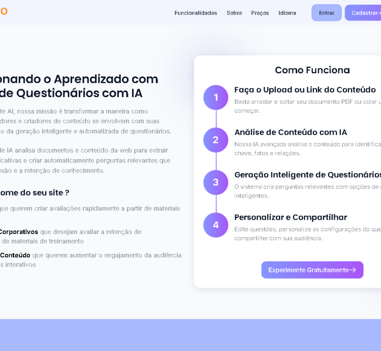 Seja professor, instrutor, empresário ou criador de conteúdo, transforme sua base de conhecimento em perguntas de múltipla escolha em segundos