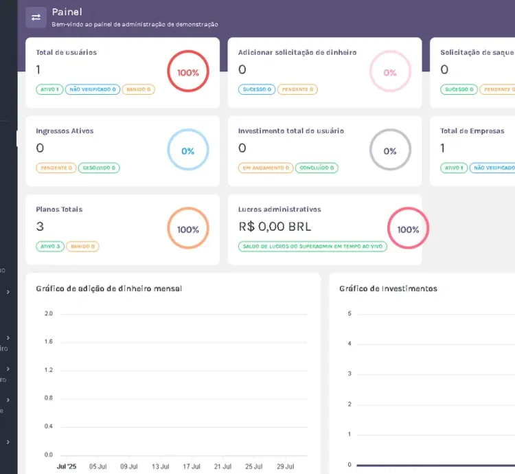 Esta plataforma apresenta três interfaces poderosas — painéis de Usuário, Empresa e Superadministrador — permitindo que as empresas criem, gerenciem e acompanhem planos de investimento sem esforço, definam termos e condições e supervisionem as relações com investidores. Os principais recursos incluem suporte a várias moedas, câmbio, registros de lucros, transferências P2P , planos de investimento personalizáveis
