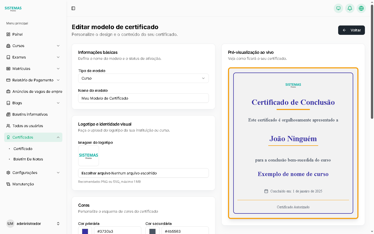 - Certificados e avaliações: automatize certificações e receba feedback dos alunos.