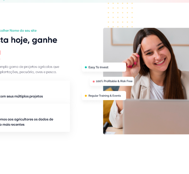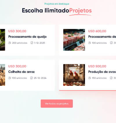Os usuários podem investir em uma seleção de projetos agrícolas e diversificar seus investimentos. O sistema permite acompanhar o progresso em tempo real.