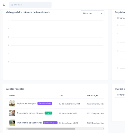O sistema organiza eventos e workshops sobre agricultura, investimentos e sustentabilidade. O recurso de reserva permite aos usuários se inscreverem e acessarem detalhes dos eventos.