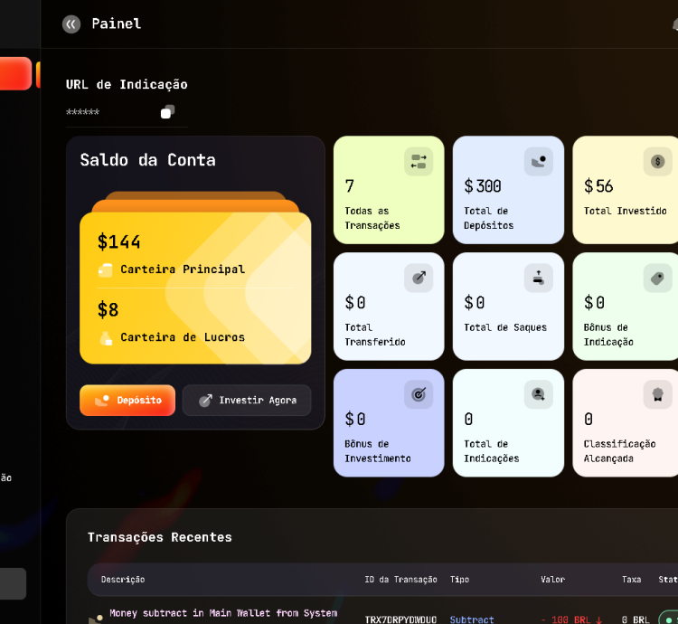 Na barra lateral do painel, há duas carteiras: uma é a carteira principal e a outra, a carteira de valor, é a carteira de lucro. Lá, o usuário pode ver a barra de envio de KYC para enviar o KYC, caso ainda não o tenha feito. Nesta página, os usuários também podem ver o nível de classificação com emblemas e links de indicação. Além disso, os usuários podem explorar estatísticas e transações recentes.
