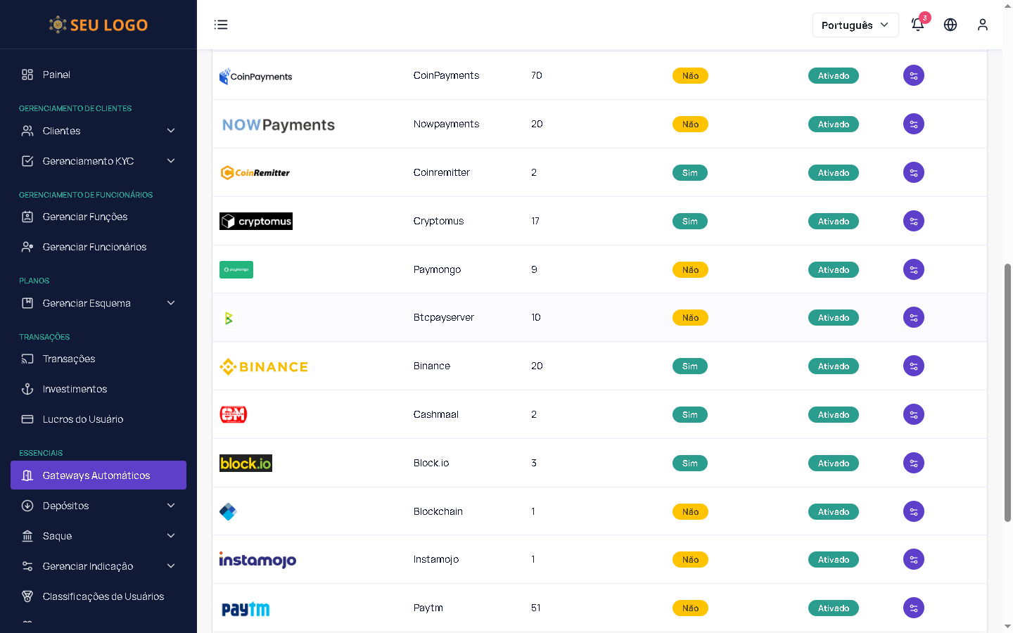 pode visualizar os gateways de pagamento automáticos para depósito e saque. Ele pode definir várias moedas em um único gateway. Gateways com suporte para diversas moedas estão disponíveis.