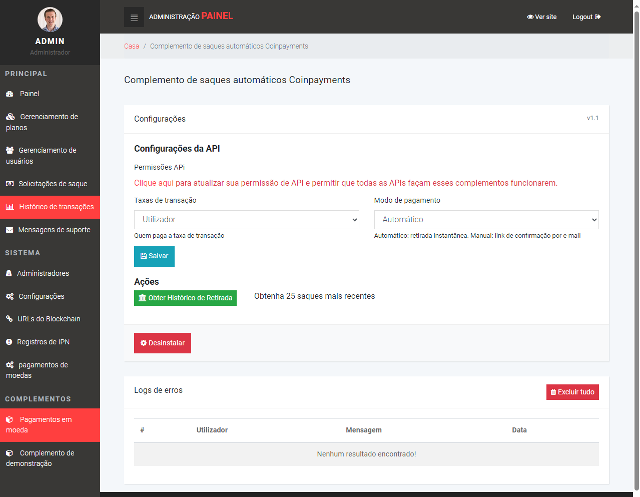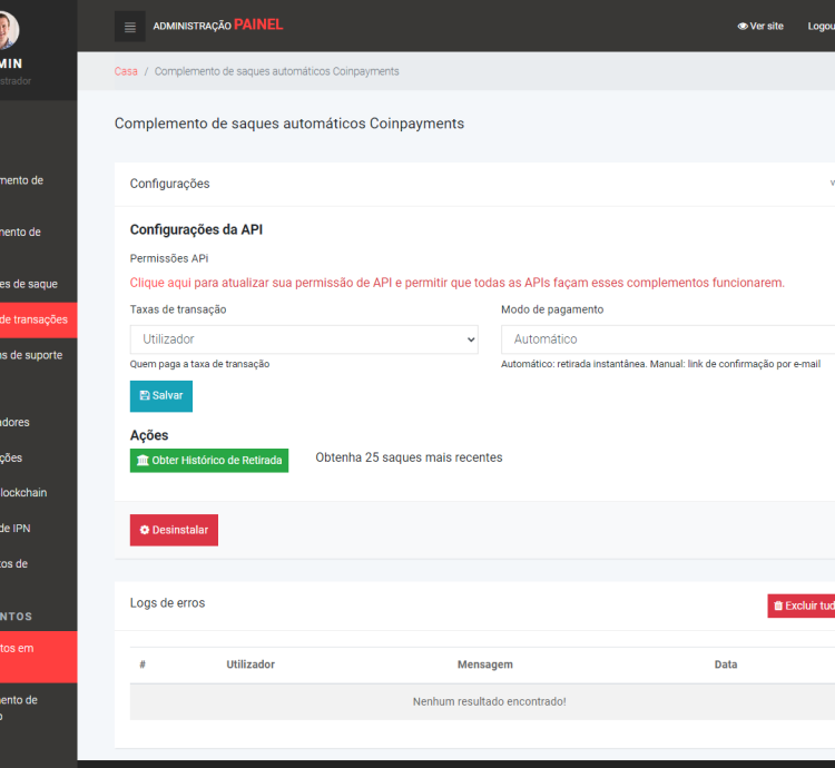 - Registros IPN: Gerenciamento das notificações de pagamento via CoinPayments.