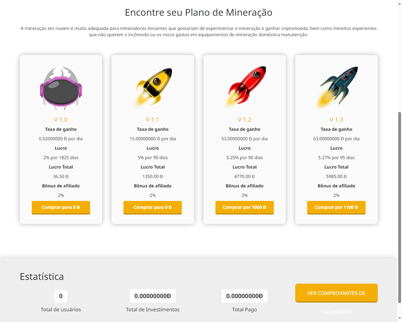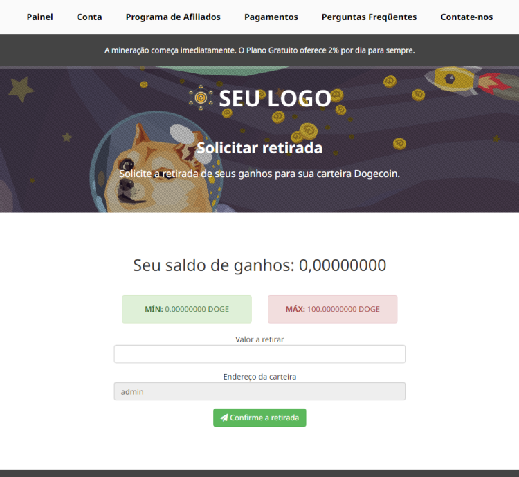 - Página de Solicitação de Retirada: Permite que os usuários solicitem a retirada de ganhos obtidos com mineração.