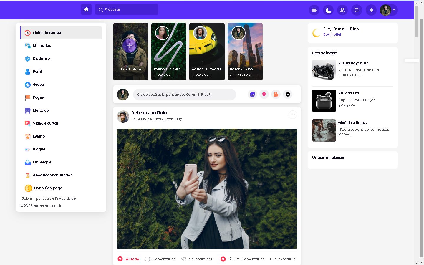 Ela permite que os usuários interajam por meio de conteúdo como postagens, eventos, grupos e páginas.